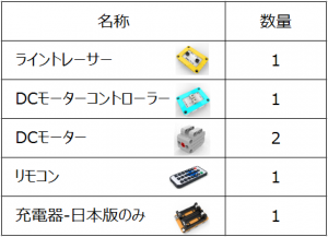 パッケージ内容/べーシックバージョン パッケージ内容/ベーシックバージョン TEC CUBIC プログラミングブロック Basic Ver. 電子ブロックリスト コントロールブロック ライントレーサー 超音波センサー DC-Motor-Controller RGB LED DCモーター IRトランシーバー リモコン 音センサー 充電器-日本版のみ メカブロック 7 パック メカブロックリスト/ベーシックバージョン その他の付属品 取扱説明書 保証書 ロータリー台紙 ライントレース紙 セパレータ タイヤ MiniUSBケーブル 充電用USBケーブル MicroUSBケーブル USBケーブル